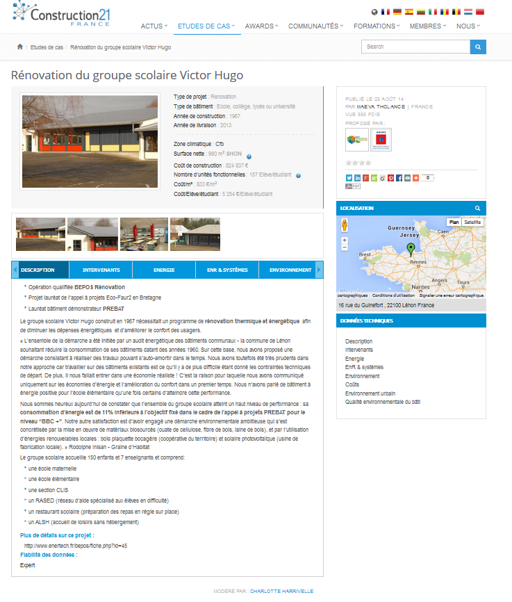274 projets référencés à ce jour en France, 5 en Bretagne, 1 projet Graine d'habitat en qualité de Bureau d'Etudes sur le premier projet BEPOS en rénovation d'un groupe scolaire en France.